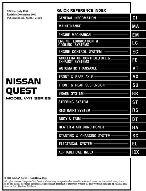 Presently you are looking regarding an 2000 Quest V41 Service And Repair Manual example that we provide here within some form of document formats such as PDF, Doc, Energy Point, and in addition images that will make it easier for you to create an 2000 Quest V41 Service And Repair Manual yourself. For a better look, you may open a few examples below. All the good examples about 2000 Quest V41 Service And Repair Manual on this web site, we get from several sources so you may create a better document of your own.